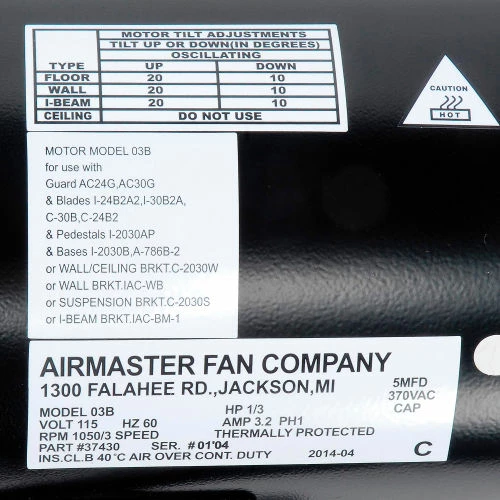 Airmaster® Fan 37430 is a Commercial Oscillating Motor, 1/3 HP, 1 Phase, 3 Speed, 115V, TEAO, ball bearing, 5/8″ diameter shaft.