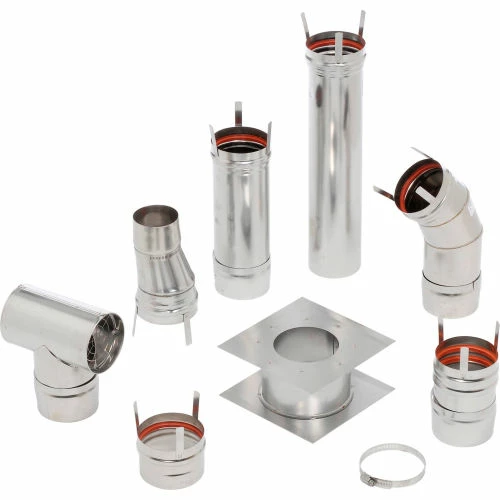 Includes: (1) 3×4 adapter – used on 50K only, (1) 4 adapter, (1) 45 degree elbow, (1) 4×12 length, (1) 4 adjustable length (6-19), (1) wall thimble, (1) 4 screened termination tee, (1) Hi-temp 2.8 oz. silicone, (1) SS screw kit. This stainless steel kit meets all of the latest 2012 building heating codes for using Category III venting.