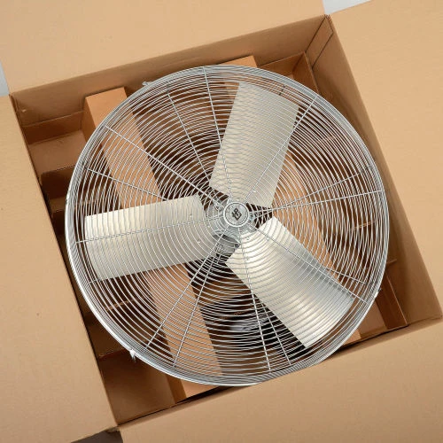 These quality fans include an enclosed permanently lubricated, PSC-type ball bearing single-phase motor for long life and optimum performance. 3 quiet aluminum blades are enclosed in double locking steel wire guards for safety. Pivot-action fan head allows vertical tilt angle adjustments. Meets OSHA standards, UL Listed ,cETL Listed.. Replace or upgrade fan heads with industrial quality air circulator heads. Includes 12’L SJT type, 3-conductor power cord. 120V. Horsepower rating based upon maximum speed/load.